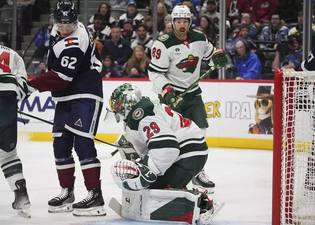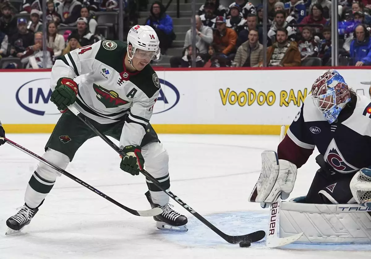 Minnesota Wild center Joel Eriksson Ek, left, redirects the puck at Colorado Avalanche goaltender Mackenzie Blackwood in the second period of an NHL hockey game Monday, Jan. 20, 2025, in Denver. (AP Photo/David Zalubowski)