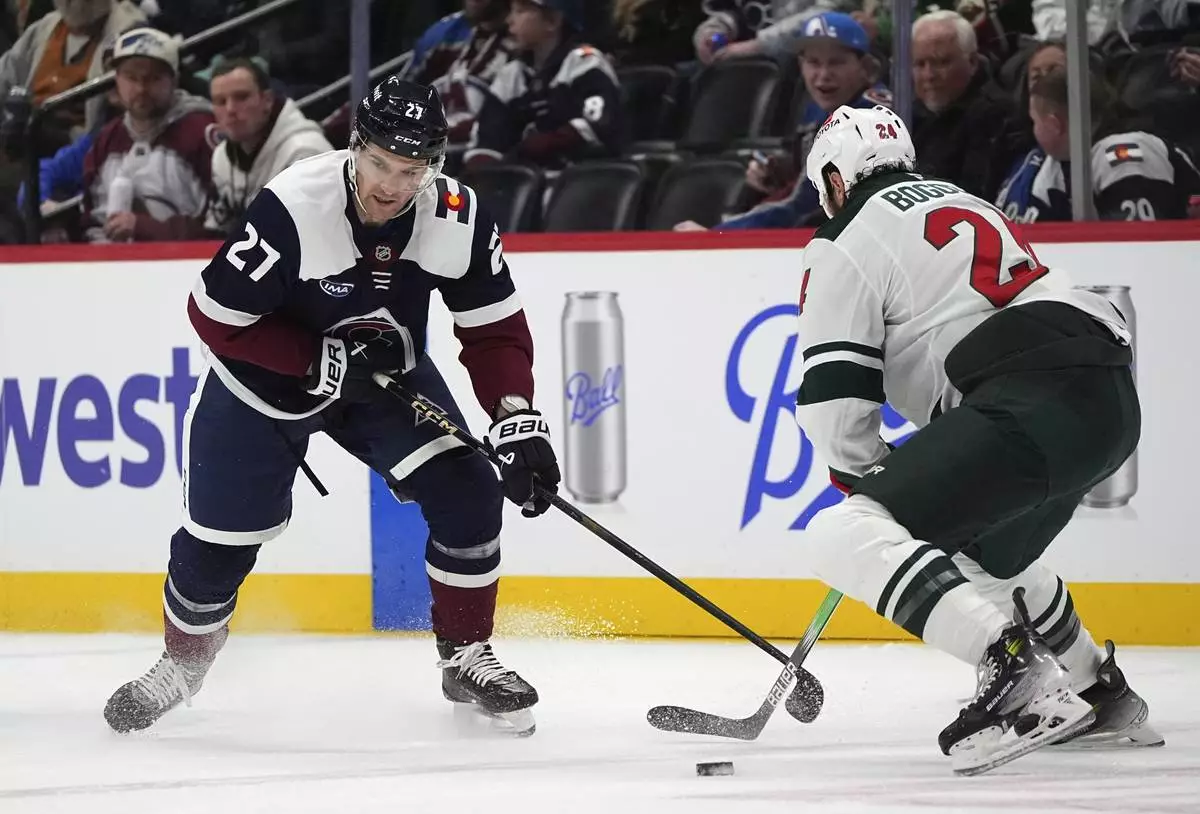 Colorado Avalanche defenseman Josh Manson, right, collects the puck as Minnesota Wild left wing Marcus Foligno defends in the second period of an NHL hockey game Monday, Jan. 20, 2025, in Denver. (AP Photo/David Zalubowski)