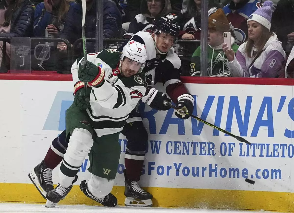 Minnesota Wild left wing Marcus Foligno, front, clears the puck after checking Colorado Avalanche left wing Artturi Lehkonen in the second period of an NHL hockey game Monday, Jan. 20, 2025, in Denver. (AP Photo/David Zalubowski)