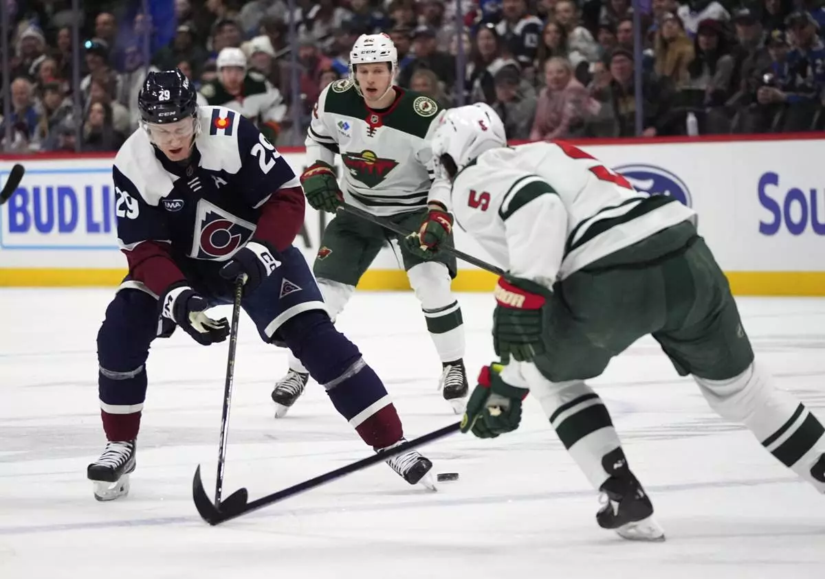 Colorado Avalanche center Nathan MacKinnon, left, loses control of the puck while driving between Minnesota Wild defenseman Jake Middleton, front right, and center Marco Rossi in the first period of an NHL hockey game Monday, Jan. 20, 2025, in Denver. (AP Photo/David Zalubowski)