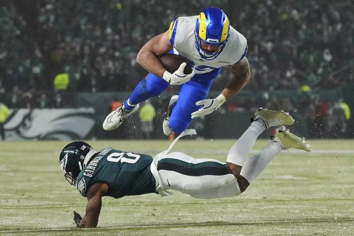 Los Angeles Rams tight end Tyler Higbee (89) is stopped by Philadelphia Eagles safety C.J. Gardner-Johnson (8) during the second half of an NFL football NFC divisional playoff game Sunday, Jan. 19, 2025, in Philadelphia. (AP Photo/Matt Slocum)