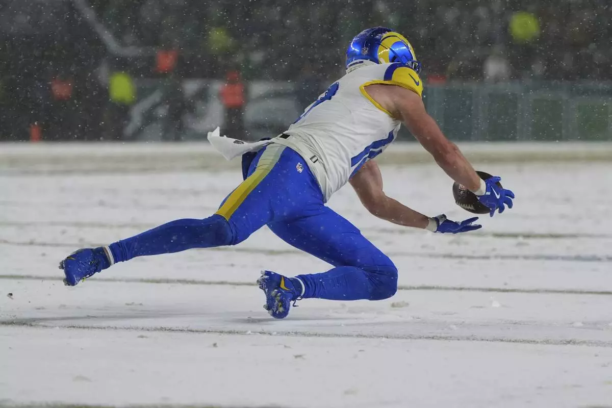 Los Angeles Rams wide receiver Cooper Kupp makes a catch during the second half of an NFL football NFC divisional playoff game against the Philadelphia Eagles on Sunday, Jan. 19, 2025, in Philadelphia. (AP Photo/Matt Slocum)