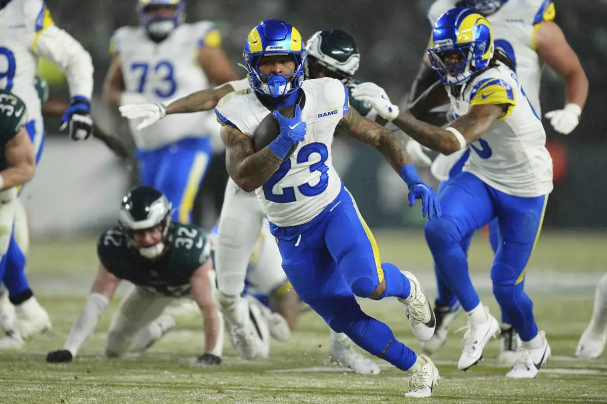 Los Angeles Rams running back Kyren Williams (23) runs with the ball during the second half of an NFL football NFC divisional playoff game against the Philadelphia Eagles on Sunday, Jan. 19, 2025, in Philadelphia. (AP Photo/Derik Hamilton)