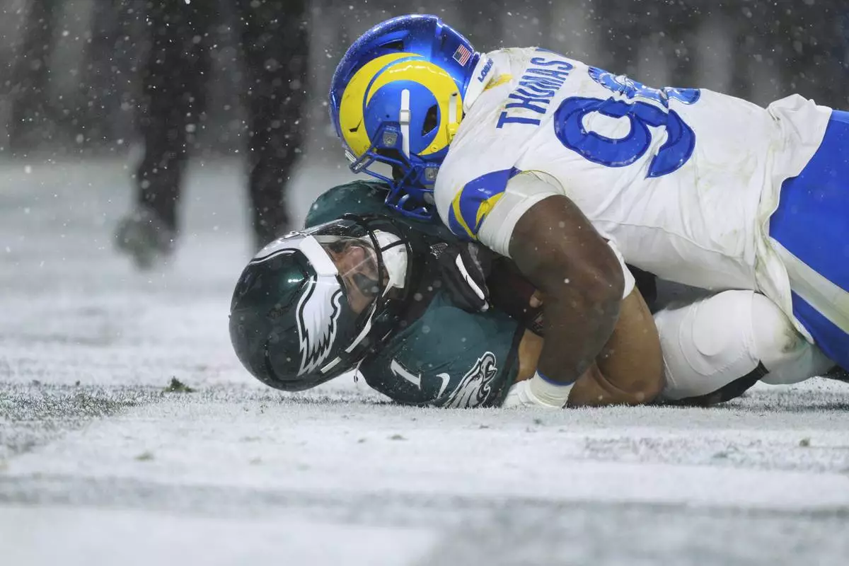 Philadelphia Eagles quarterback Jalen Hurts (1) is tackled by Los Angeles Rams linebacker Keir Thomas (96) during the second half of an NFL football NFC divisional playoff game Sunday, Jan. 19, 2025, in Philadelphia. (AP Photo/Derik Hamilton)