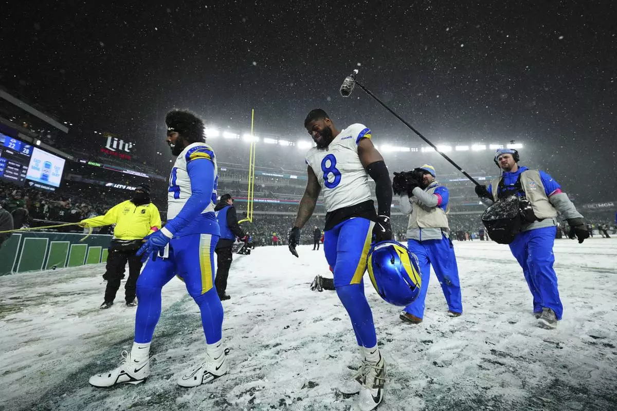 Los Angeles Rams linebacker Jared Verse (8) walks off the field after an NFL football NFC divisional playoff game against the Philadelphia Eagles on Sunday, Jan. 19, 2025, in Philadelphia. (AP Photo/Derik Hamilton)