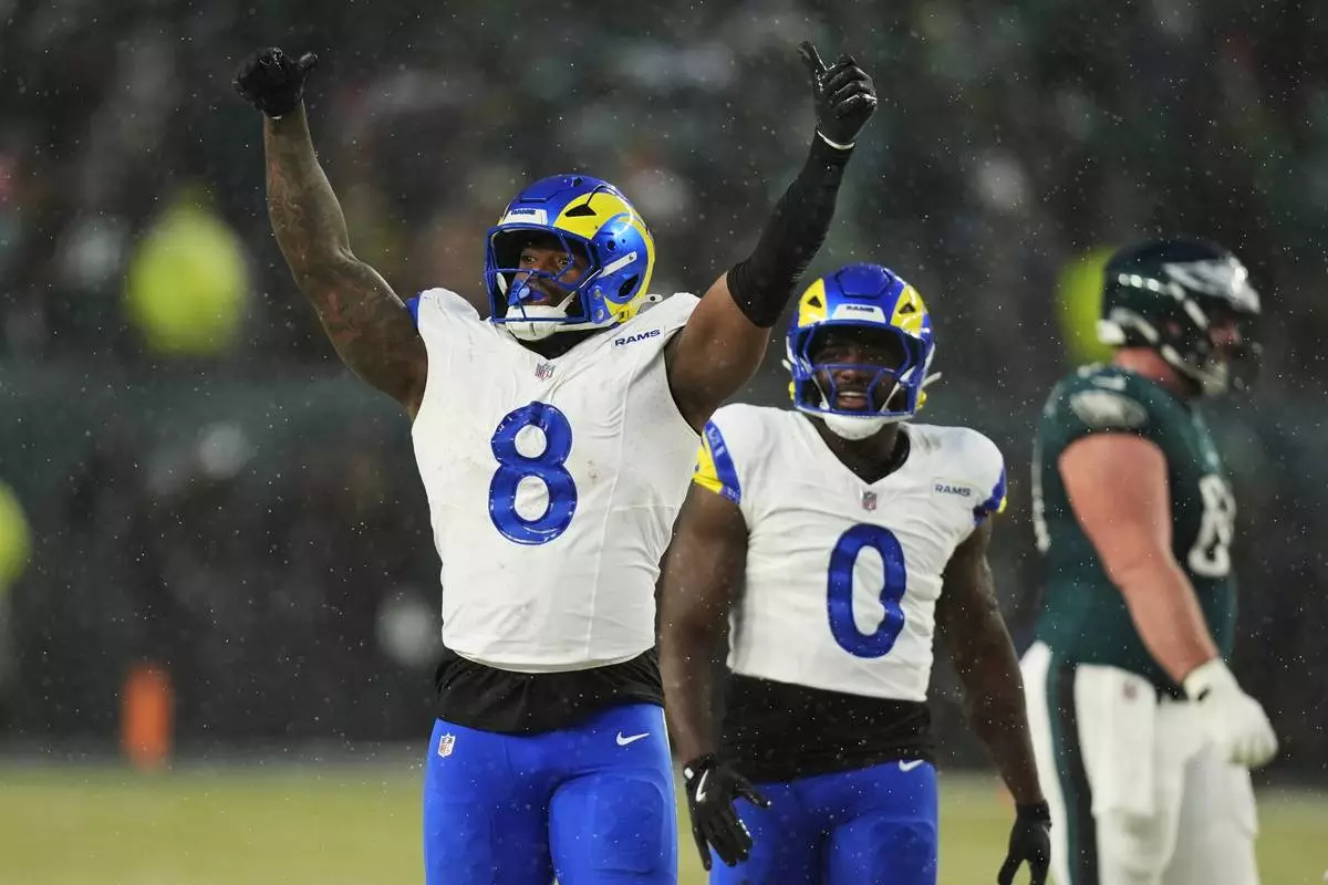 Los Angeles Rams linebacker Jared Verse (8) celebrates sacking Philadelphia Eagles quarterback Jalen Hurts (1) during the first half of an NFL football NFC divisional playoff game Sunday, Jan. 19, 2025, in Philadelphia. (AP Photo/Chris Szagola)