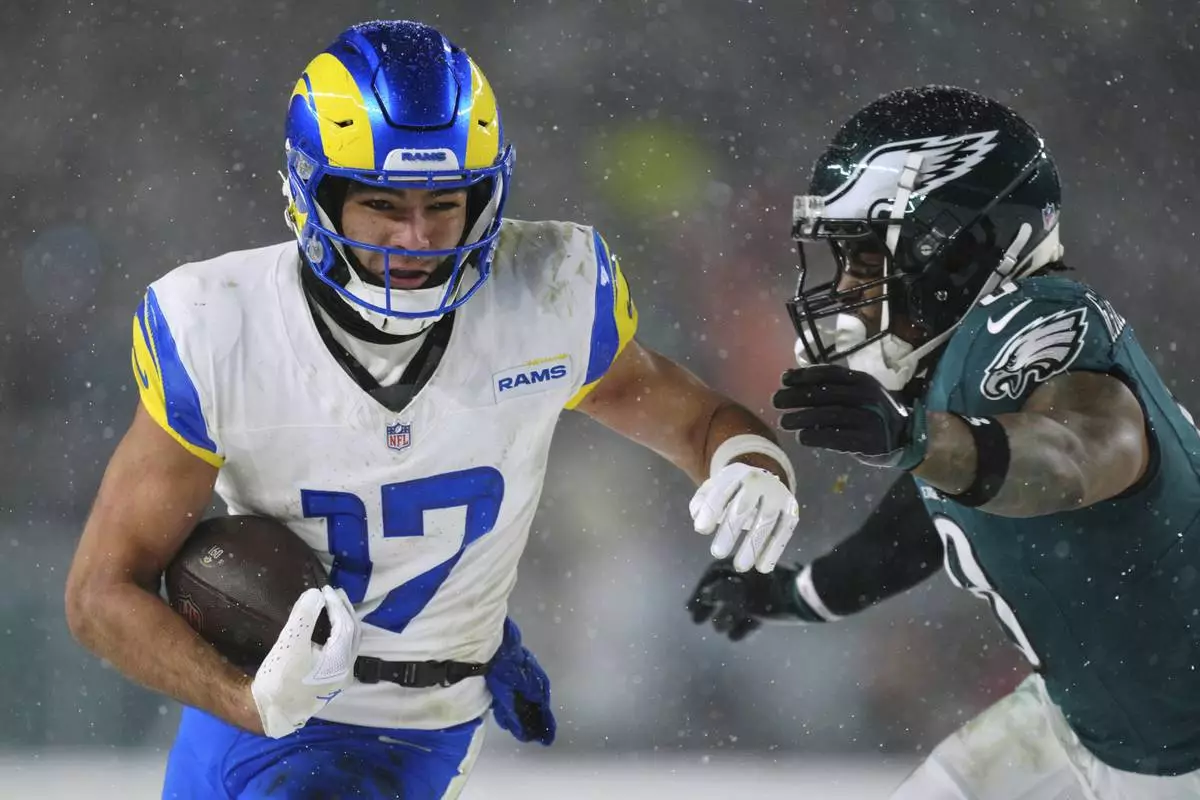 Los Angeles Rams wide receiver Puka Nacua (17) runs with the ball as Philadelphia Eagles safety C.J. Gardner-Johnson (8) tries to stop him during the second half of an NFL football NFC divisional playoff game Sunday, Jan. 19, 2025, in Philadelphia. (AP Photo/Derik Hamilton)