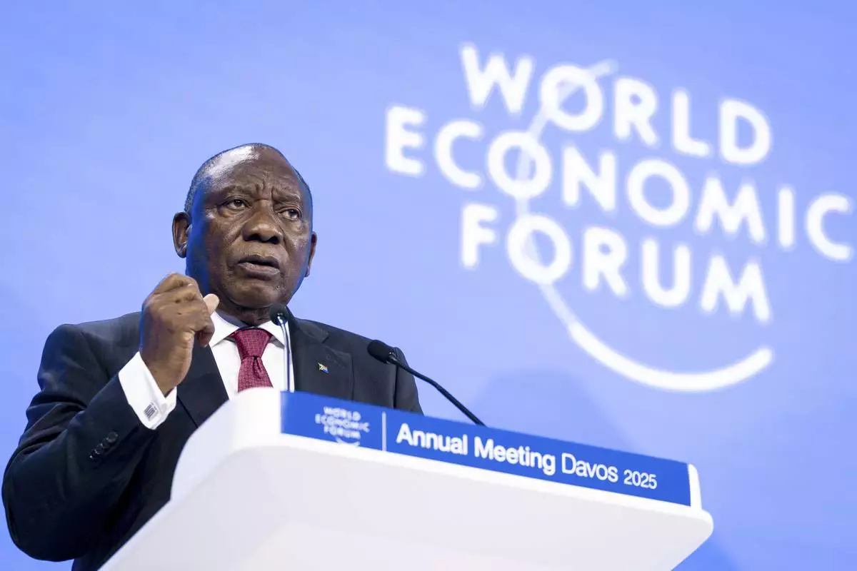 Cyril Ramaphosa, President of South Africa delivers a speech during a plenary session in the Congress Hall, during the 55th annual meeting of the World Economic Forum, WEF, in Davos, Switzerland, Tuesday, Jan. 21, 2025. (Michael Buholzer/Keystone via AP)
