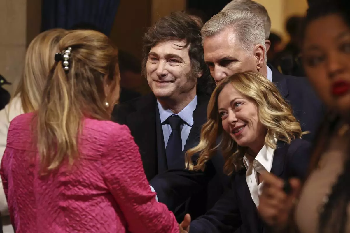 Argentina's President Javier Milei, center, former Speaker of the House Kevin McCarthy, top right, and Italian Premier Giorgia Meloni arrive before the 60th Presidential Inauguration in the Rotunda of the U.S. Capitol in Washington, Monday, Jan. 20, 2025. (Chip Somodevilla/Pool Photo via AP)