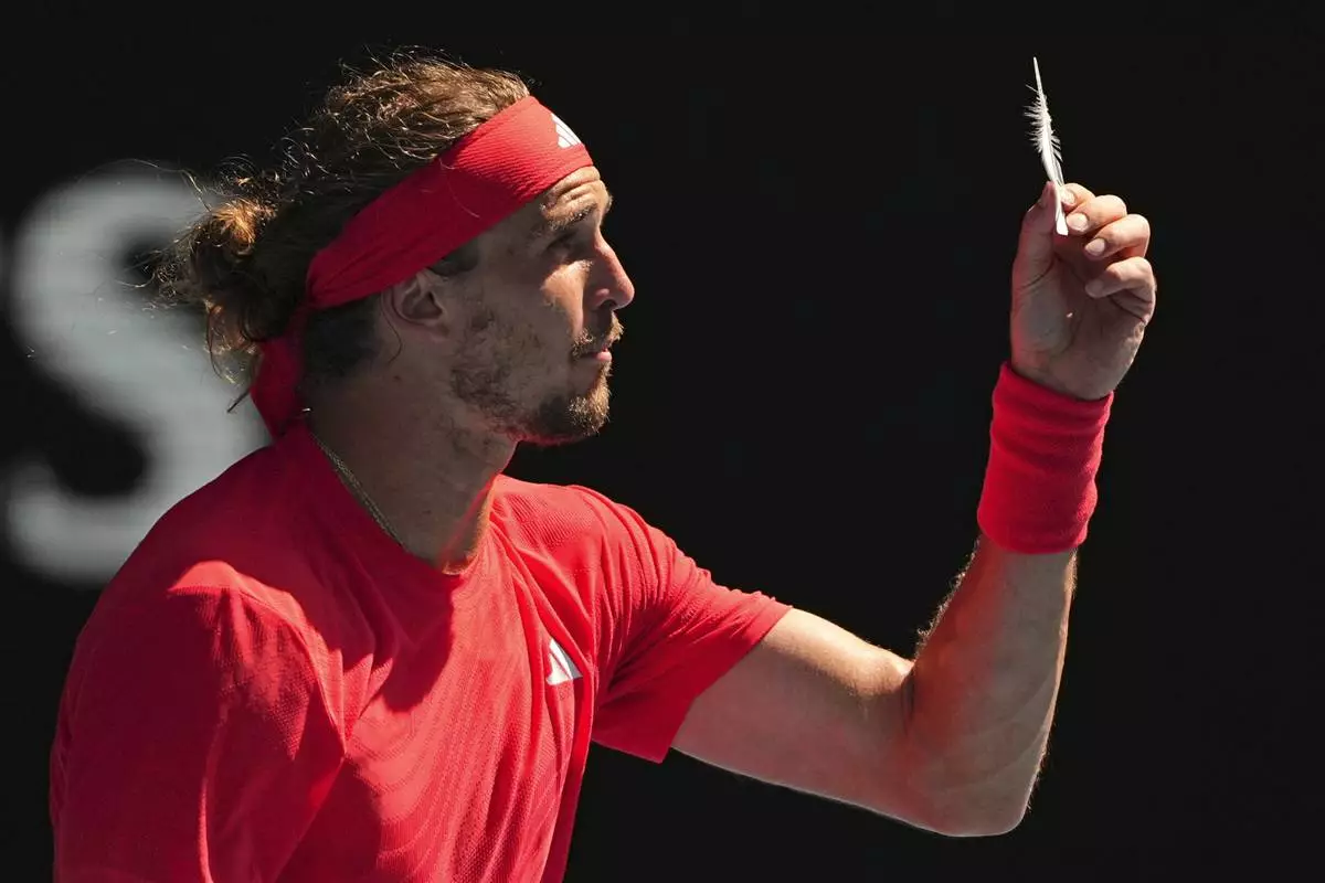 Alexander Zverev of Germany reacts as he holds a feather during his quarterfinal match against Tommy Paul of the U.S. during their quarterfinal match at the Australian Open tennis championship in Melbourne, Australia, Tuesday, Jan. 21, 2025. (AP Photo/Vincent Thian)