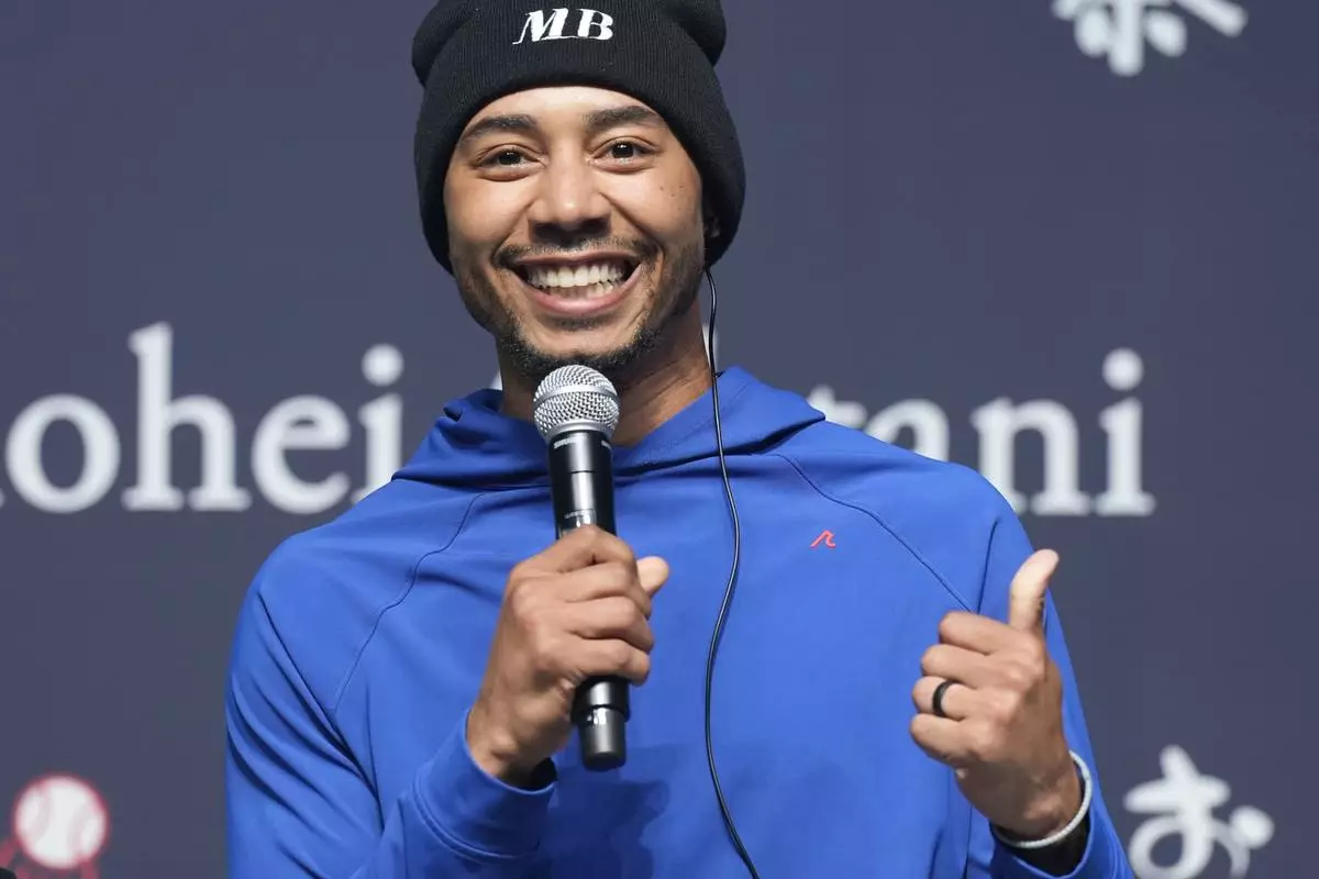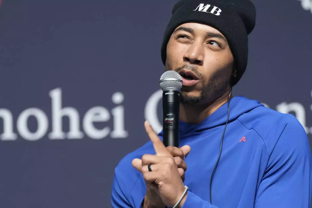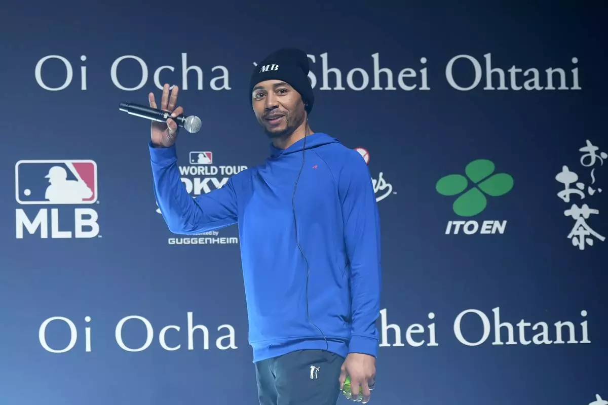 Los Angeles Dodgers right fielder Mookie Betts speaks during a sponsor's promotional event in Tokyo, Tuesday, Jan. 21, 2025. (AP Photo/Eugene Hoshiko)