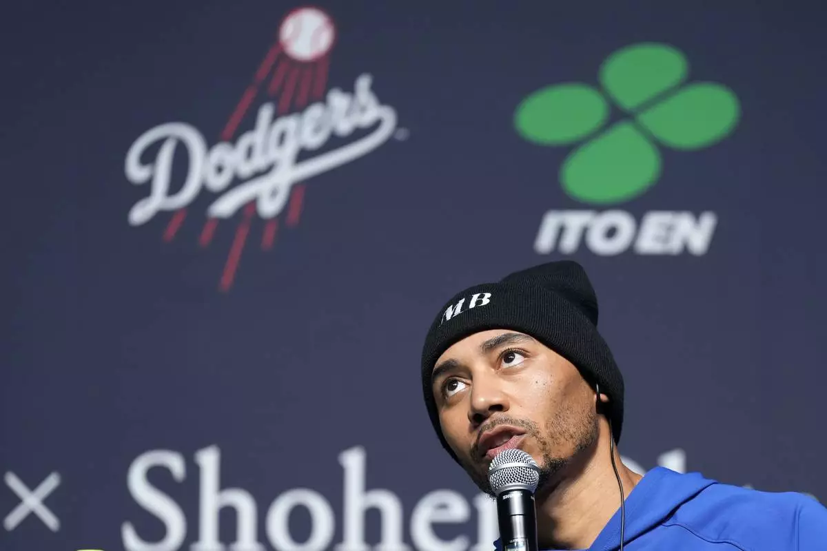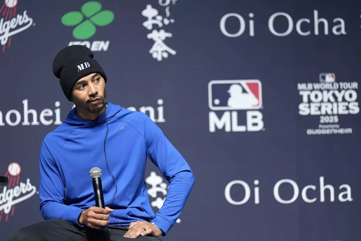 Los Angeles Dodgers right fielder Mookie Betts listens a question from a journalist during a sponsor's promotional event in Tokyo, Tuesday, Jan. 21, 2025. (AP Photo/Eugene Hoshiko)