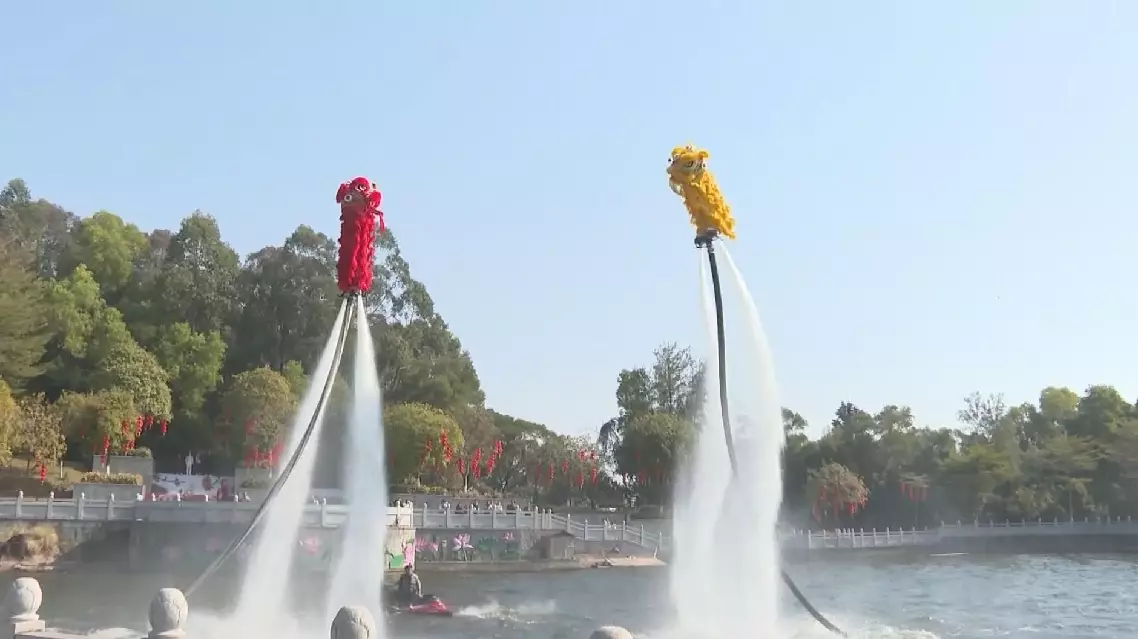 A captivating Guangdong Lion Dance performance was staged at the Lianhuashan Tourist Scenic Area in Guangzhou City. Aerial lion dance performers took to the skies, stepping onto flying devices to deliver a thrilling show above the water, blending traditional lion dance culture with modern technology.