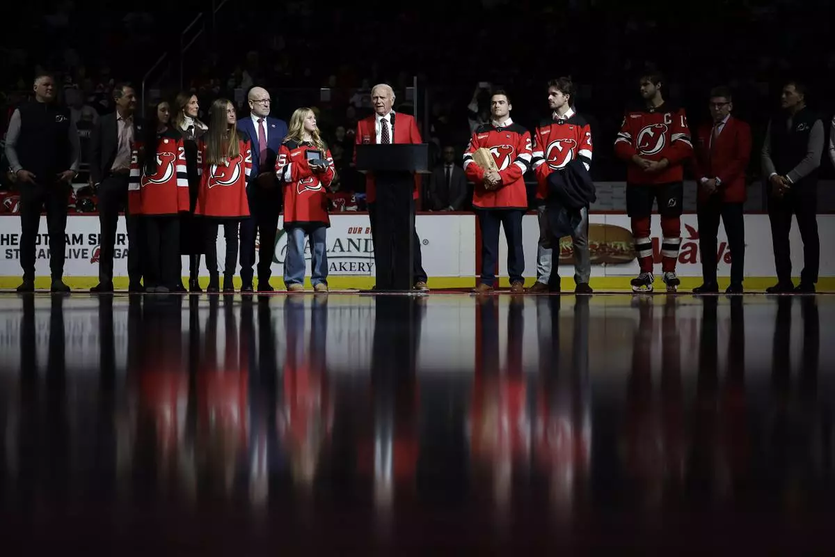 He was joined at center ice by former players including goaltender Martin Brodeur, defensemen Scott Stevens, Scott Niedermayer and Larry Robinson.