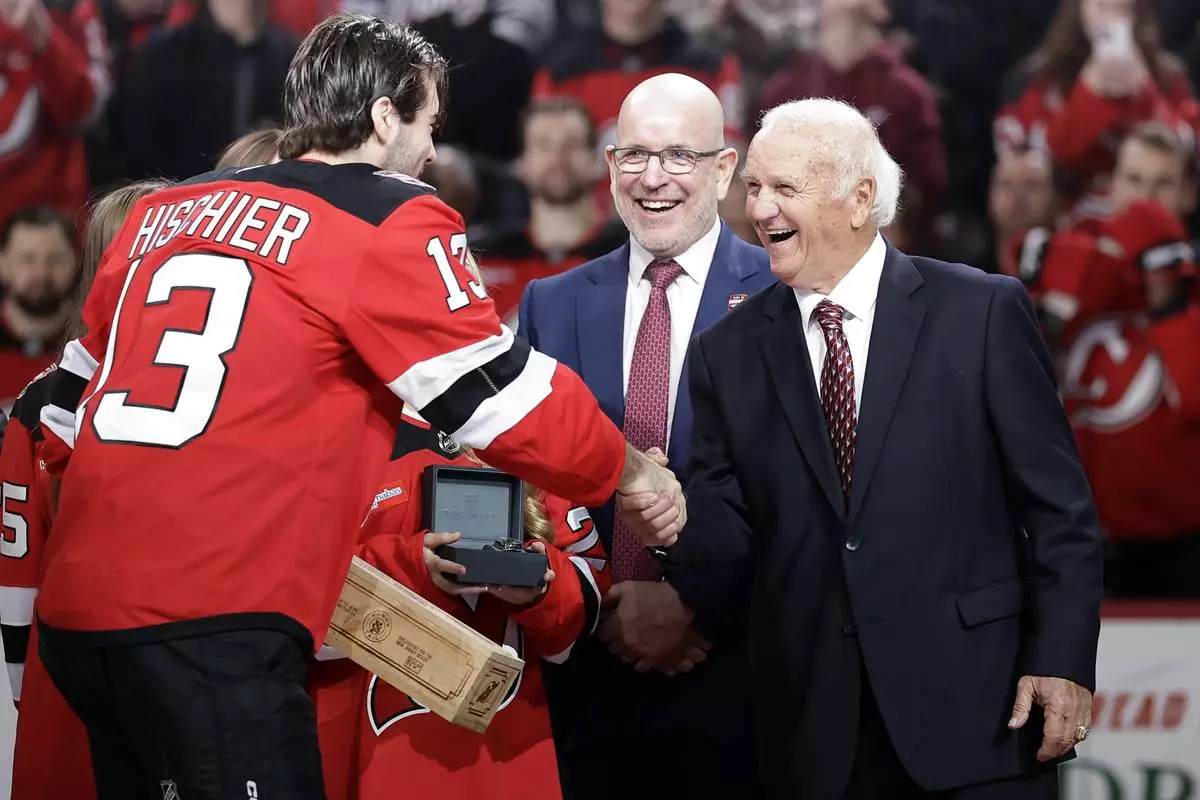 Former New Jersey Devils head coach Jacques Lemaire shakes hands with Devils' Nico Hischier during a ceremony inducting him into the Devils' 'Ring of Honor' before an NHL hockey game against the Boston Bruins, Wednesday, Jan. 22, 2025, in Newark, N.J. (AP Photo/Adam Hunger)