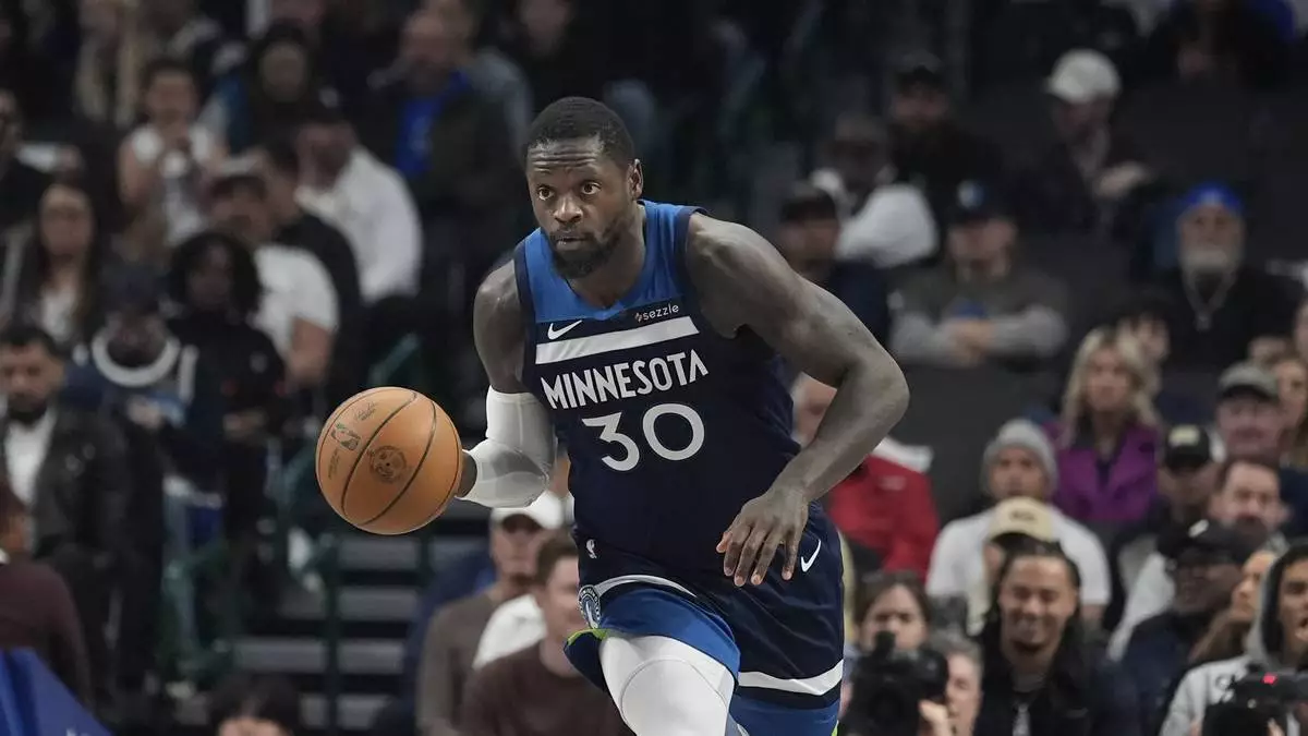 Minnesota Timberwolves forward Julius Randle (30) dribbles during the first half of an NBA basketball game against the Dallas Mavericks Wednesday, Jan. 22, 2025, in Dallas. (AP Photo/LM Otero)