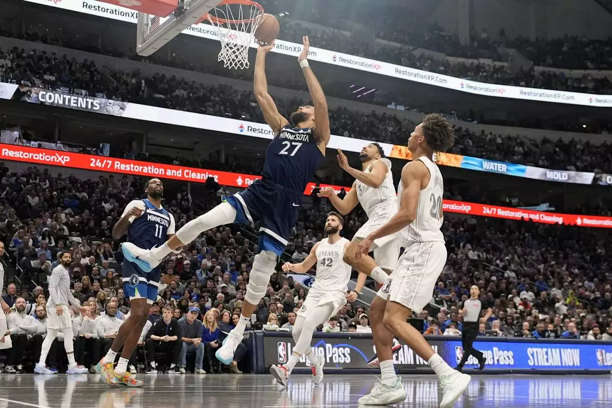 Minnesota Timberwolves center Rudy Gobert (27) shoots as teammate center Naz Reid (11) looks on against Dallas Mavericks defenders Kessler Edwards (20), Quentin Grimes (5) and Maxi Kleber (42) during the first half of an NBA basketball game Wednesday, Jan. 22, 2025, in Dallas. (AP Photo/LM Otero)