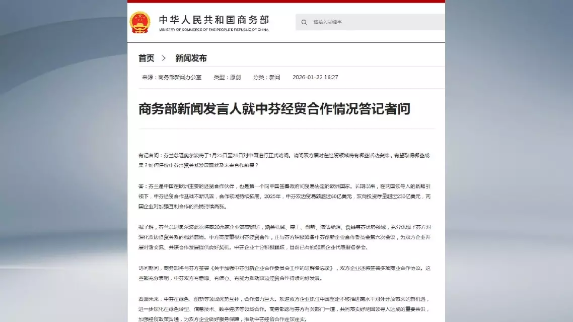 The Ministry of Commerce expressed its readiness to work with relevant Finnish institutions to implement the important consensus reached by the leaders of both countries, enhance communication on economic and trade policies, provide quality services to enterprises, and further deepen and solidify bilateral cooperation.