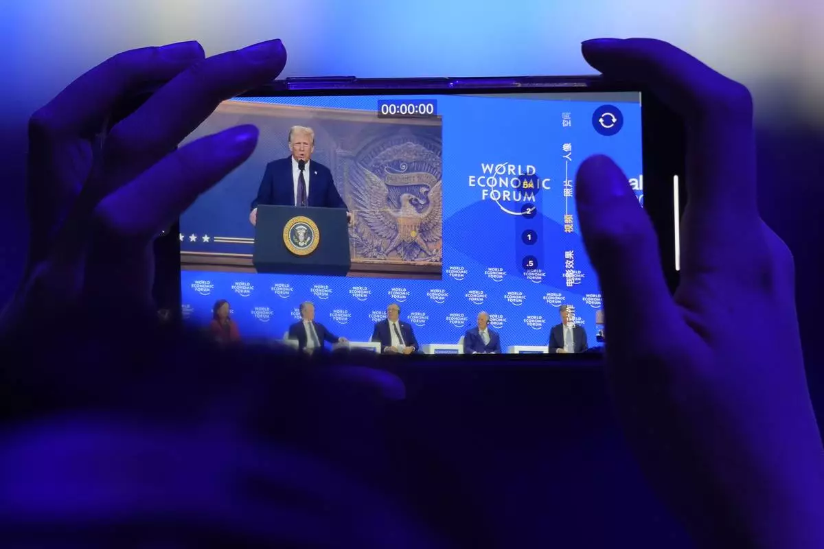 A woman takes pictures during a virtual speech of U.S. president Donald Trump at the Annual Meeting of World Economic Forum in Davos, Switzerland, Thursday, Jan. 23, 2025. (AP Photo/Markus Schreiber)