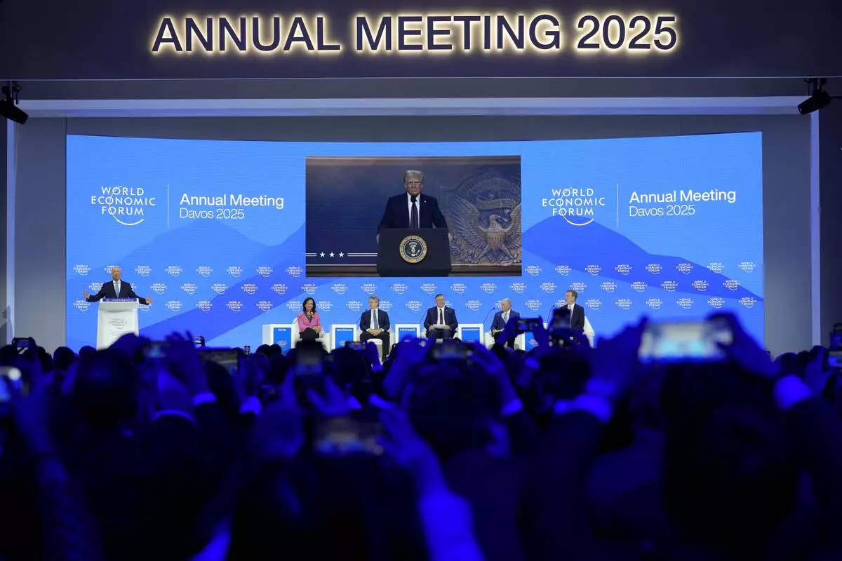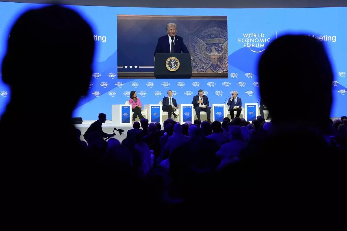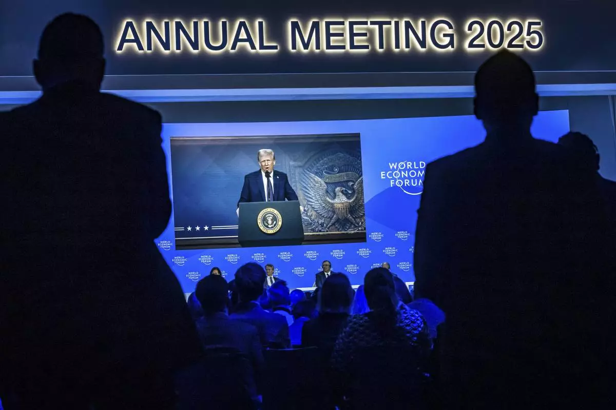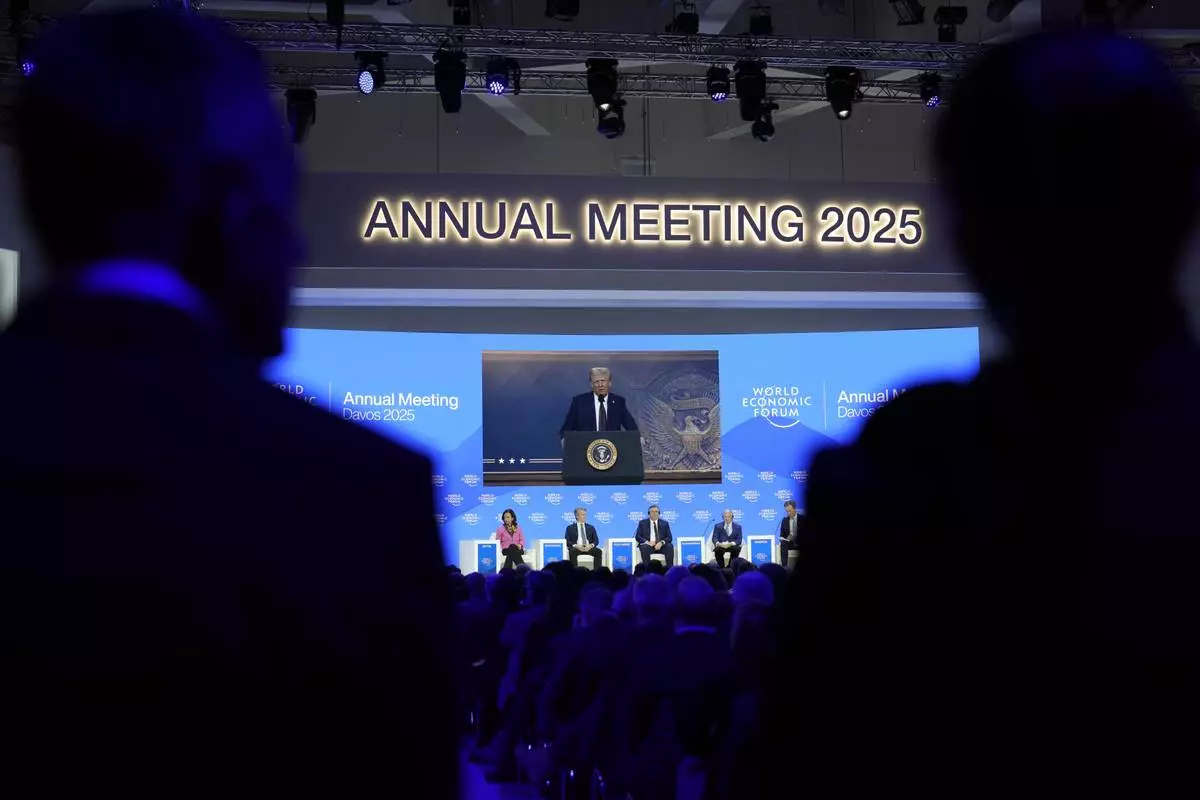 US President Donald J. Trump is shown on screens as he addresses via remote connection a plenary session in the Congress Hall, during the 55th annual meeting of the World Economic Forum (WEF), in Davos, Switzerland, Thursday, Jan. 23, 2025. (Michael Buholzer/Keystone via AP)
