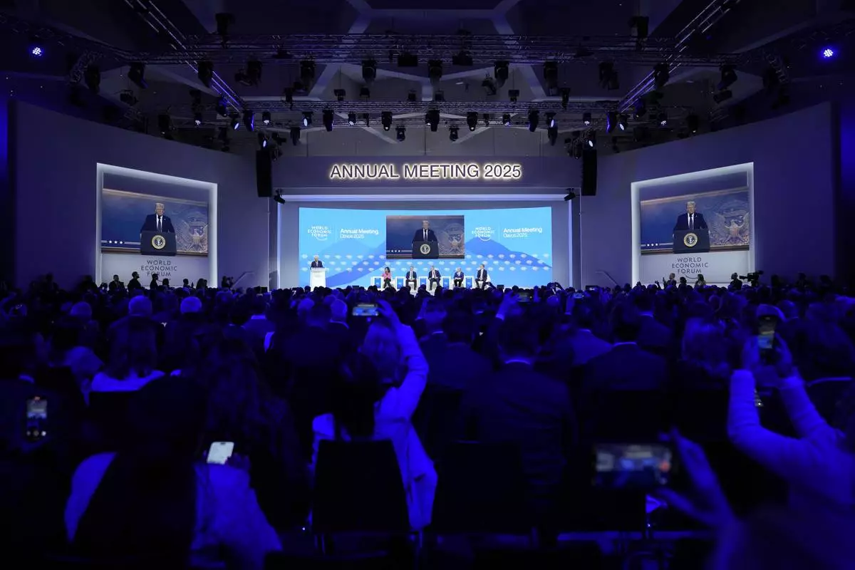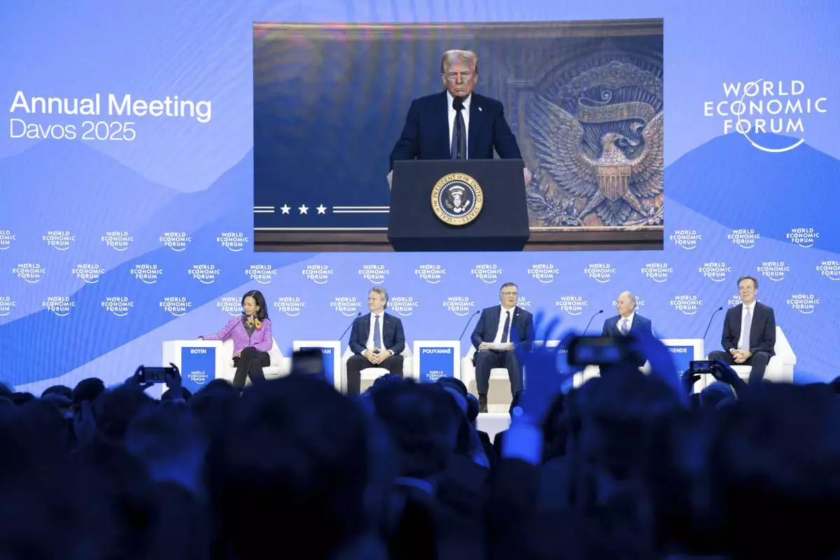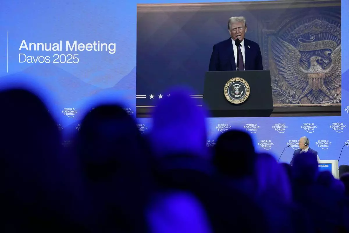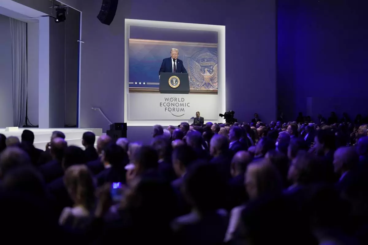 US President Donald J. Trump is shown on screens as he addresses via remote connection a plenary session in the Congress Hall, during the 55th annual meeting of the World Economic Forum (WEF), in Davos, Switzerland, Thursday, Jan. 23, 2025. (Michael Buholzer/Keystone via AP)