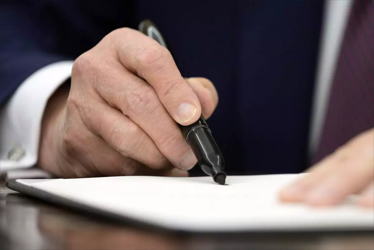 President Donald Trump signs an executive order in the Oval Office of the White House, Thursday, Jan. 23, 2025, in Washington. (AP Photo/Ben Curtis)
