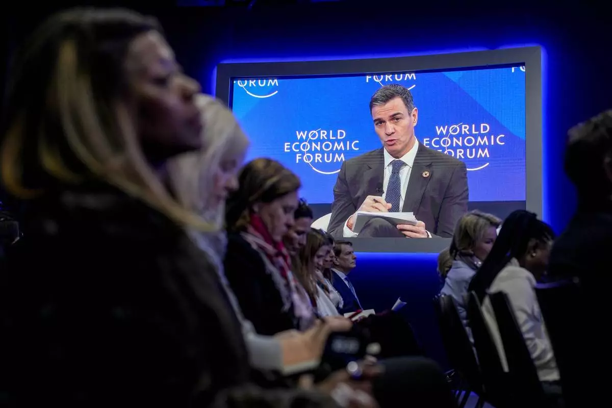 Prime Minister of Spain Pedro Sanchez speaks at the Annual Meeting of World Economic Forum in Davos, Switzerland, Wednesday Jan. 22, 2025. (AP Photo/Markus Schreiber)
