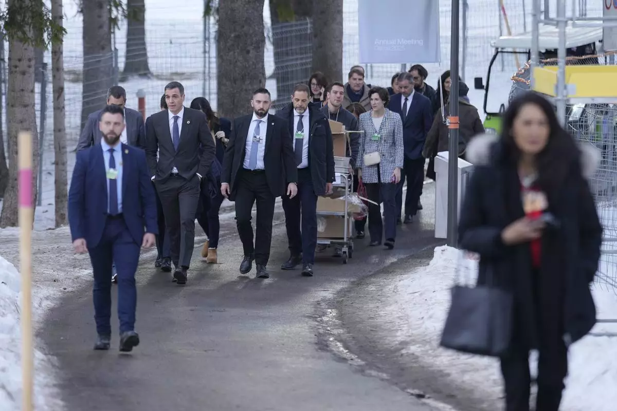 Prime Minister of Spain Pedro Sanchez, left in background, walks in the snow at the Annual Meeting of World Economic Forum in Davos, Switzerland, Wednesday, Jan. 22, 2025. (AP Photo/Markus Schreiber)