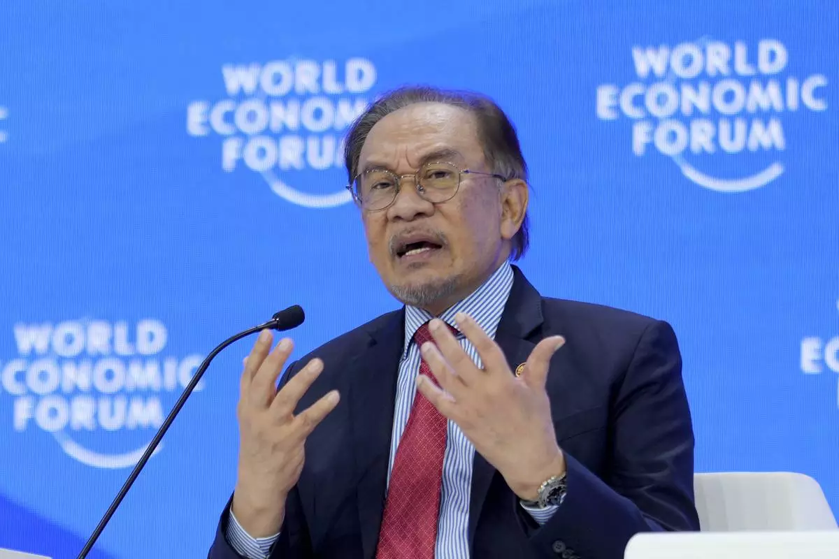 Malaysian Prime Minister Anwar Ibrahim speaks the Annual Meeting of World Economic Forum in Davos, Switzerland, Wednesday, Jan. 22, 2025. (AP Photo/Markus Schreiber)