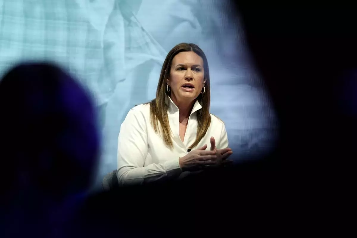 Arkansas Gov. Sarah Huckabee Sanders speaks at the Annual Meeting of World Economic Forum in Davos, Switzerland, Thursday, Jan. 23, 2025. (AP Photo/Markus Schreiber)