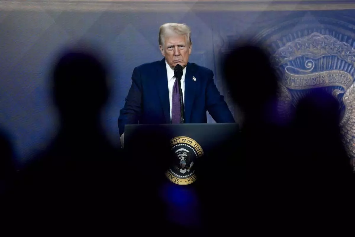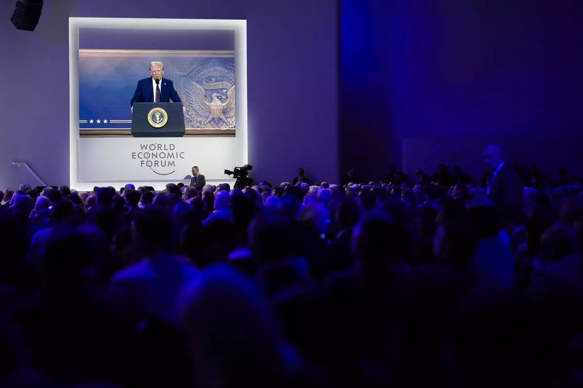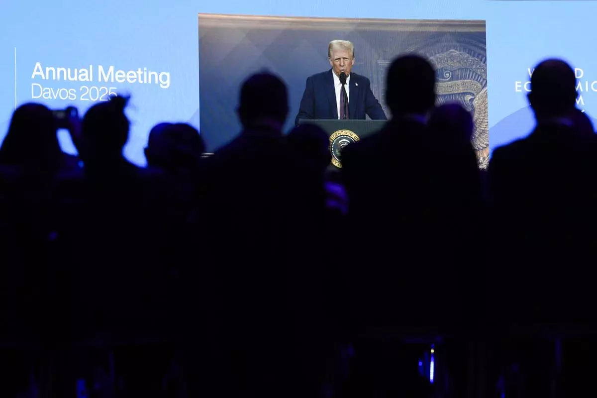 Attendees listen to a virtual speech delivered by U.S. president Donald Trump, at the Annual Meeting of World Economic Forum in Davos, Switzerland, Thursday, Jan. 23, 2025. (AP Photo/Markus Schreiber)