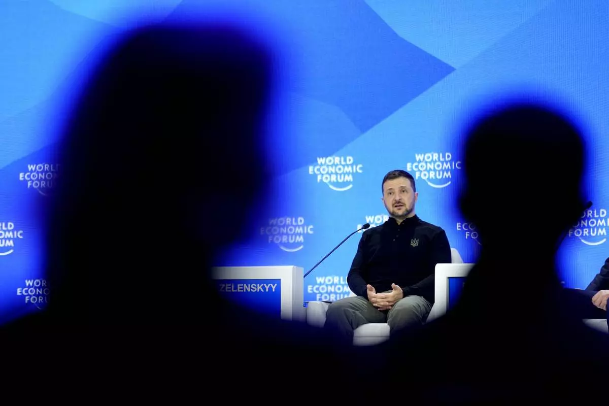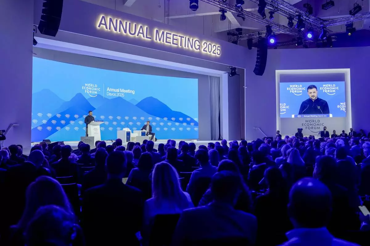 Ukrainian President Volodymyr Zelenskyy speaks at the Annual Meeting of World Economic Forum in Davos, Switzerland, Tuesday, Jan. 21, 2025. (AP Photo/Markus Schreiber)