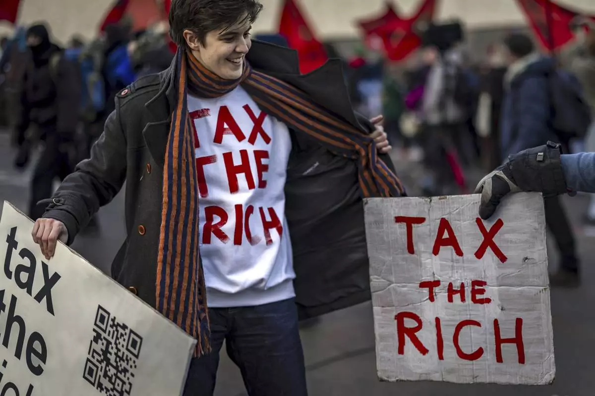 Activist Marlene Engelhorn holds banners during a protest at the Meeting of World Economic Forum in Davos, Switzerland, Thursday, Jan. 23, 2025. (Michael Buholzer/Keystone via AP)