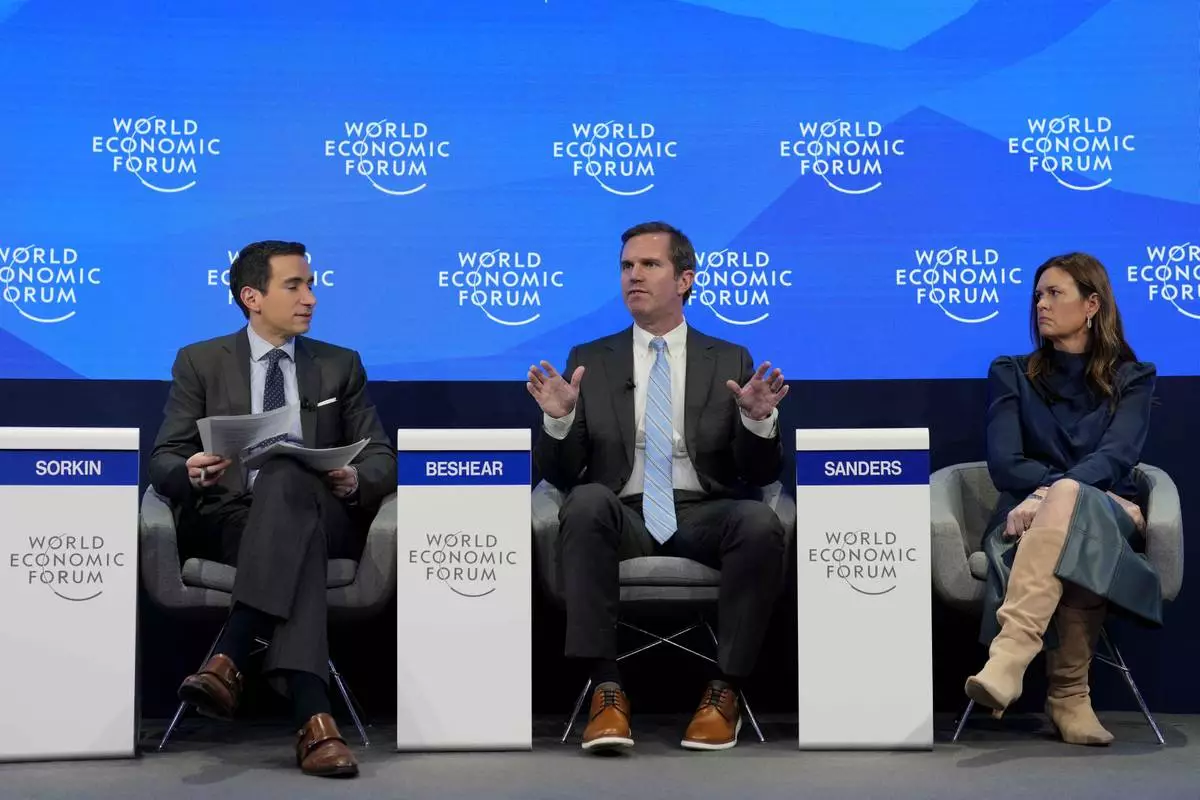 Kentucky Governor Andy Beshear, center, gestures besides Arkansas Gov. Sarah Huckabee Sanders at the Annual Meeting of World Economic Forum in Davos, Switzerland, Thursday, Jan. 23, 2025. (AP Photo/Markus Schreiber)