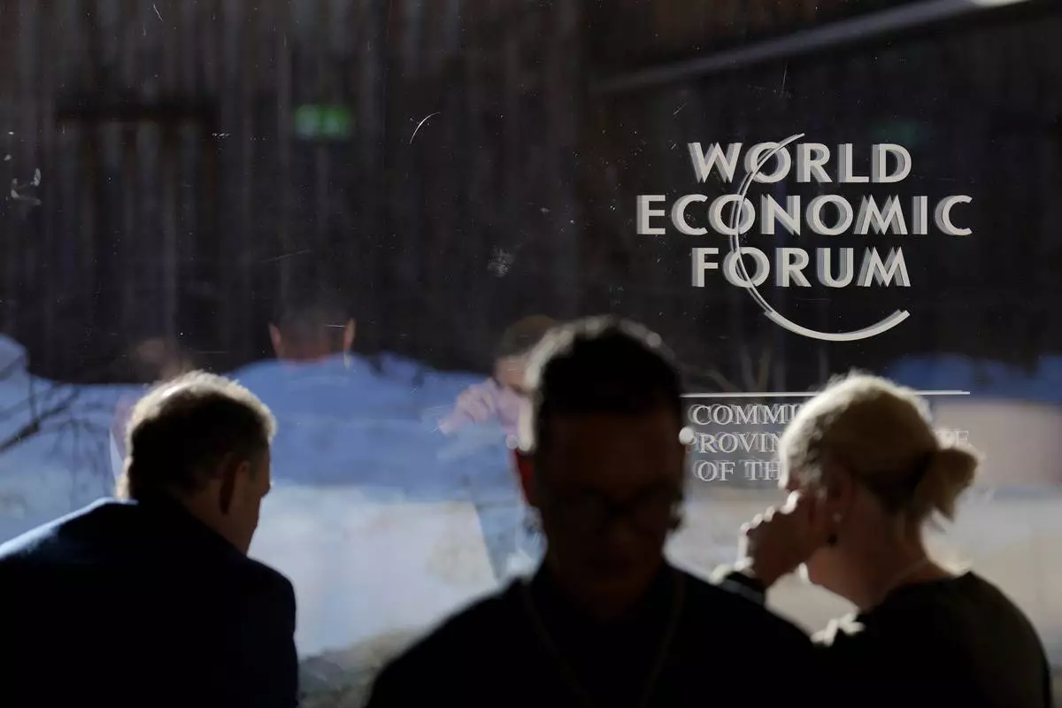 The logo of the World Economic Forum is displayed on a window at the congress center in Davos, Switzerland, Thursday, Jan. 23, 2025. (AP Photo/Markus Schreiber)