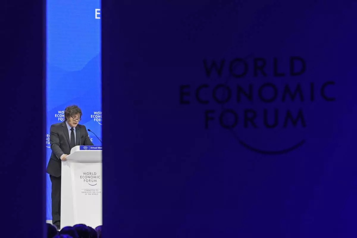 Argentina's President Javier Milei delivers his speech at the Annual Meeting of World Economic Forum in Davos, Switzerland, Thursday, Jan. 23, 2025. (AP Photo/Markus Schreiber)
