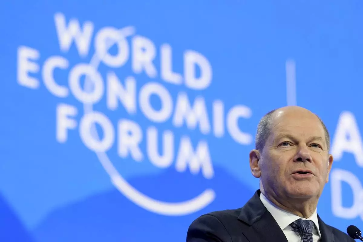 German Chancellor Olaf Scholz speaks at the Annual Meeting of World Economic Forum in Davos, Switzerland, Tuesday, Jan. 21, 2025. (AP Photo/Markus Schreiber)