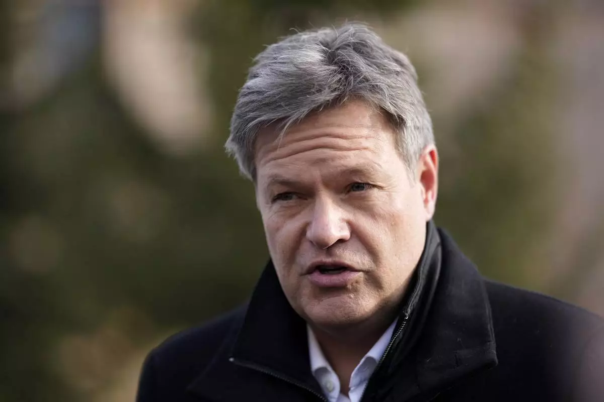 German Economy and Climate Minister Robert Habeck answers questions outside the congress center at the Annual Meeting of World Economic Forum in Davos, Switzerland, Thursday, Jan. 23, 2025. (AP Photo/Markus Schreiber)