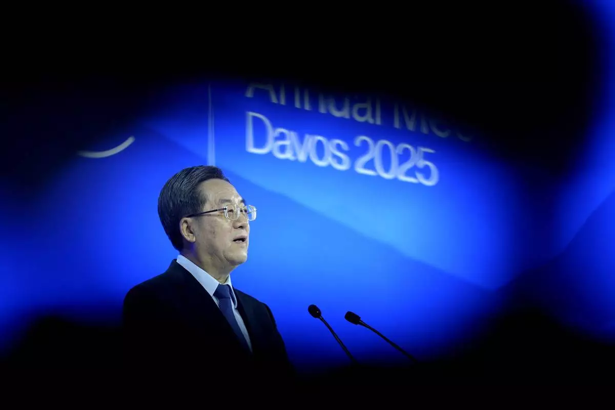 China's Vice Prime Minister Ding Xuexiang speaks at the Annual Meeting of World Economic Forum in Davos, Switzerland, Tuesday, Jan. 21, 2025. (AP Photo/Markus Schreiber)