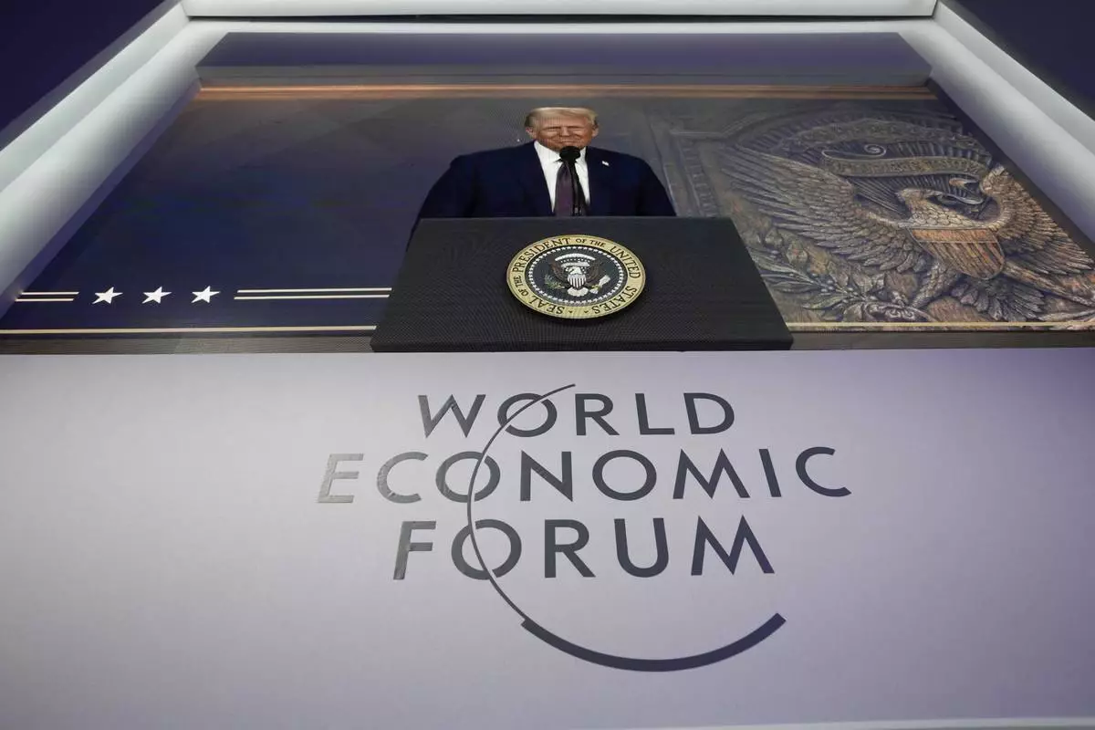 US President Donald J. Trump is shown on screens as he addresses via remote connection a plenary session in the Congress Hall, during the 55th annual meeting of the World Economic Forum (WEF), in Davos, Switzerland, Thursday, Jan. 23, 2025. (Michael Buholzer/Keystone via AP)