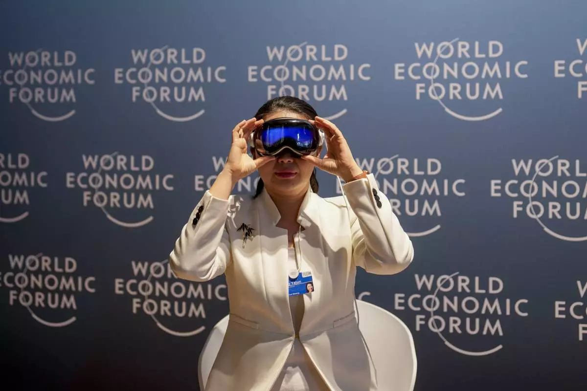 A woman uses virtual reality glasses the Annual Meeting of World Economic Forum in Davos, Switzerland, Wednesday, Jan. 22, 2025. (AP Photo/Markus Schreiber)