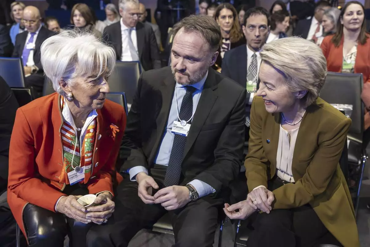 From left, President of the European Central Bank Christine Lagarde, European Commissioner for Energy and Housing Dan Jorgensen, and President of the European Commission Ursula von der Leyen speak as they attend the 55th annual meeting of the World Economic Forum (WEF), in Davos, Switzerland, Thursday, Jan. 23, 2025. (Michael Buholzer/Keystone via AP)