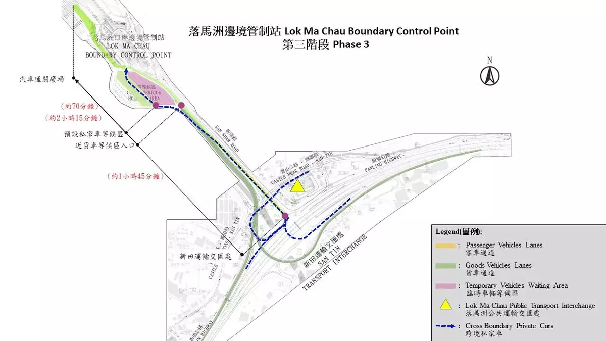 - The traffic arrangements for cross-boundary private cars and goods vehicles remain unchanged, they will continue to enter the boundary control point through the passenger vehicle lanes via San Tin Interchange or the goods vehicle lanes respectively;