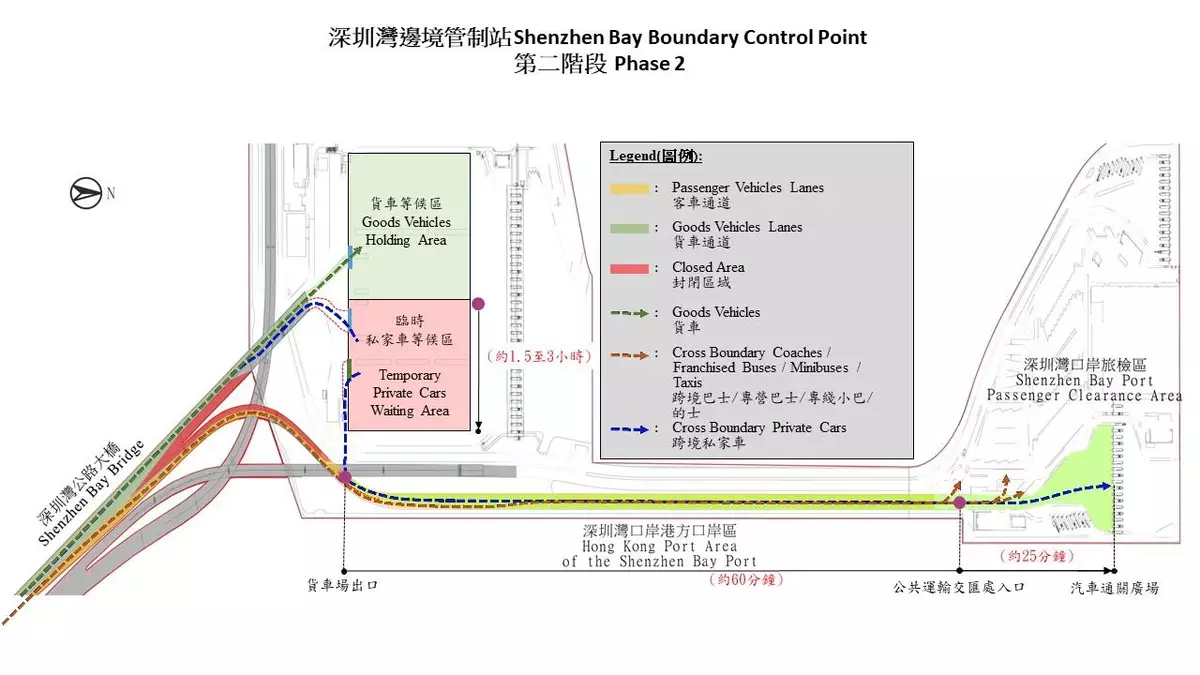 - Cross-boundary private cars must keep left on the Shenzhen Bay Bridge and then enter the designated waiting area through the goods vehicle lanes. Private cars will queue up and await further instructions to proceed to the clearance area for departure procedures.