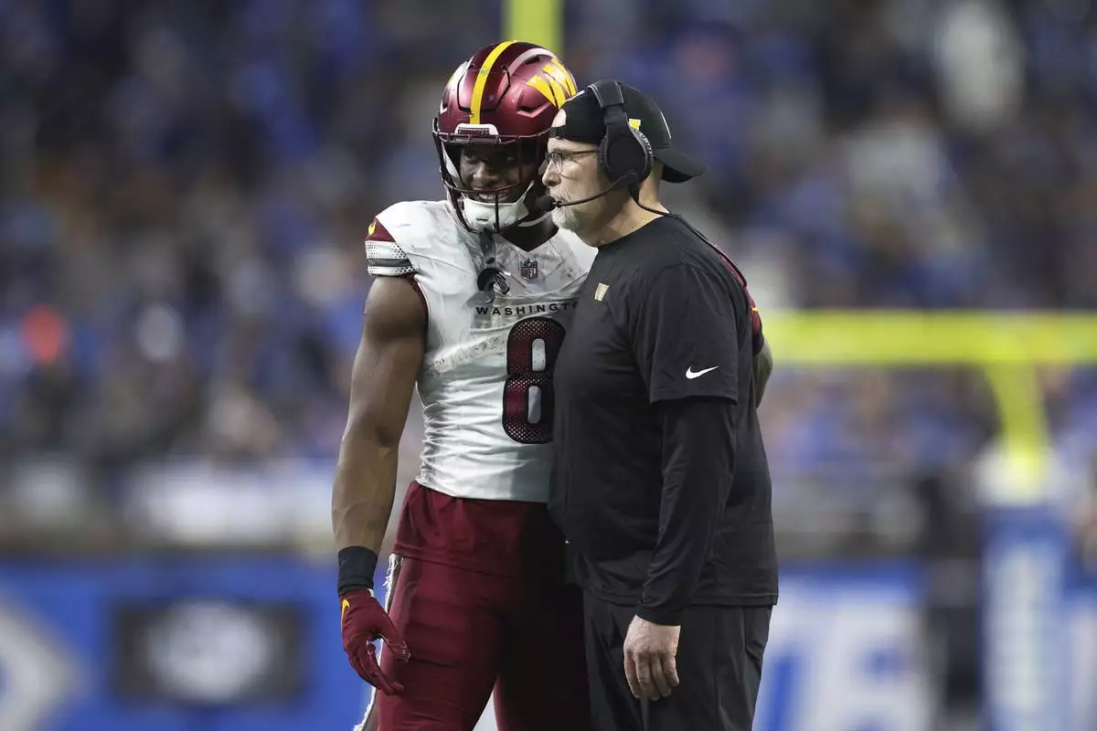 Washington Commanders running back Brian Robinson Jr. (8) talks with Washington head coach Dan Quinn during the second half of an NFL football divisional playoff game against the Detroit Lions, Saturday, Jan. 18, 2025, in Detroit. (AP Photo/Mike Mulholland)