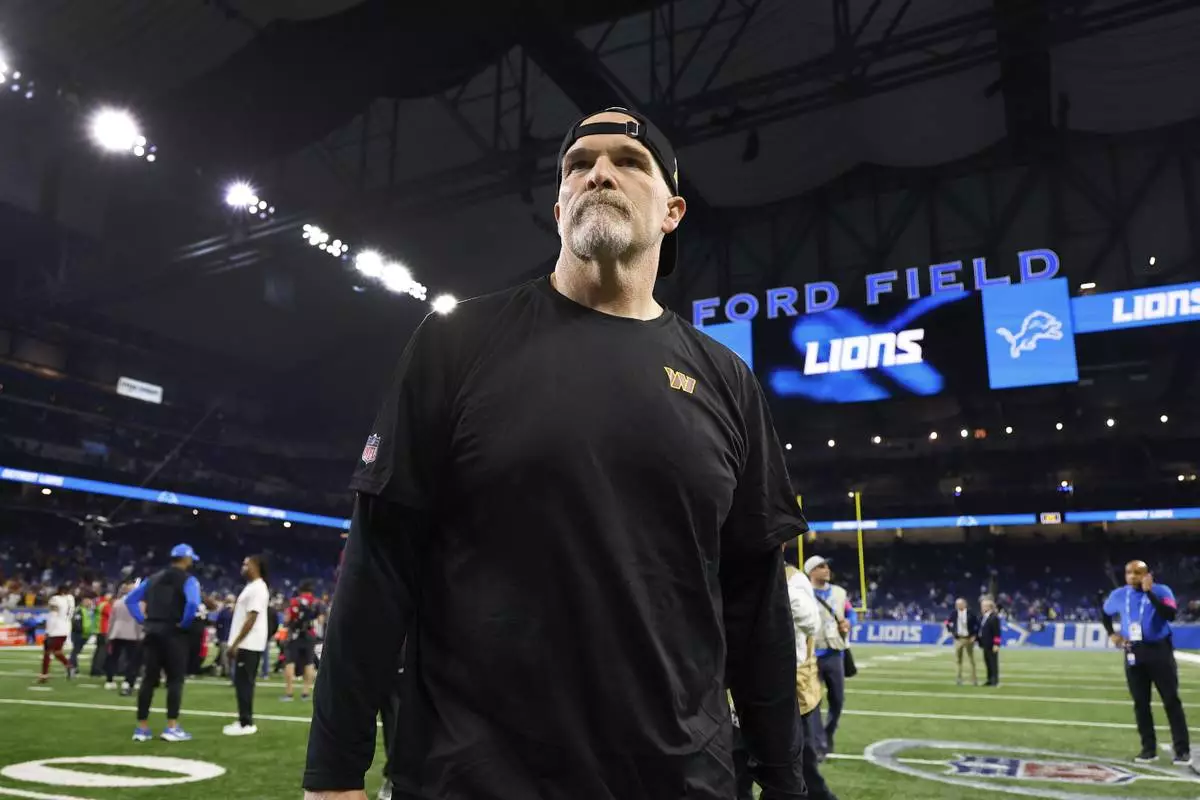 Washington Commanders head coach Dan Quinn walks on the field after an NFL football divisional playoff game against the Detroit Lions, Saturday, Jan. 18, 2025, in Detroit. (AP Photo/Rey Del Rio)