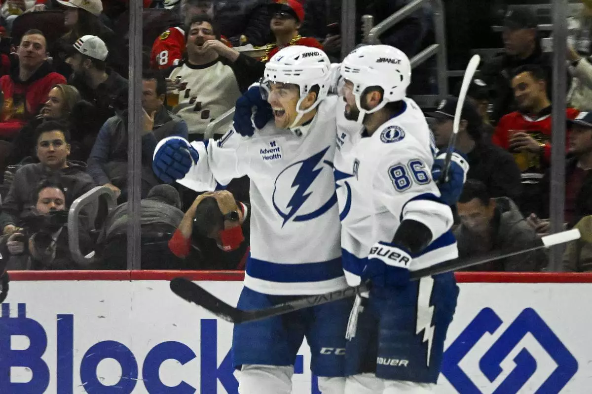 Tampa Bay Lightning right wing Mitchell Chaffee, left, celebrates his goal against the Chicago Blackhawks with right wing Nikita Kucherov (86), during the first period of an NHL hockey game, Friday, Jan. 24, 2025, in Chicago. (AP Photo/Matt Marton)