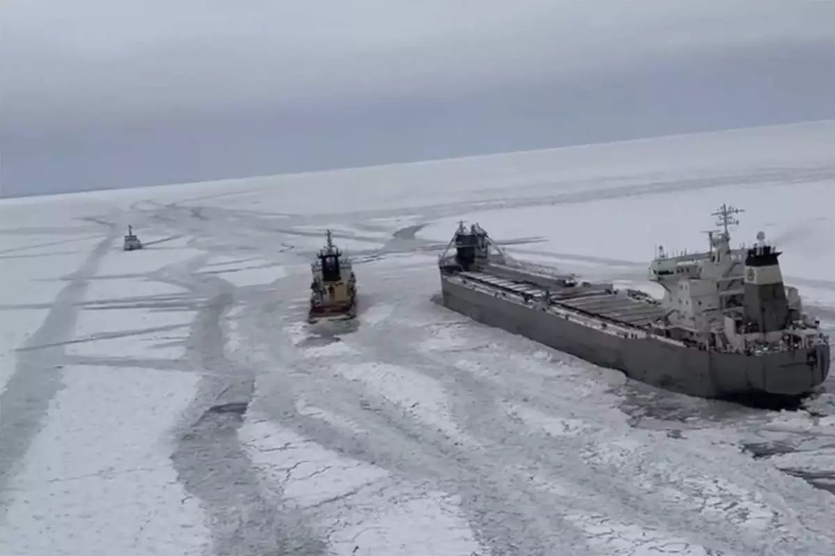 The ship wasn't damaged, and its crew is safe, officials said. Freighters in the Great Lakes often encounter surface ice in the winter but sometimes run into ice that is too hard or thick to break through.