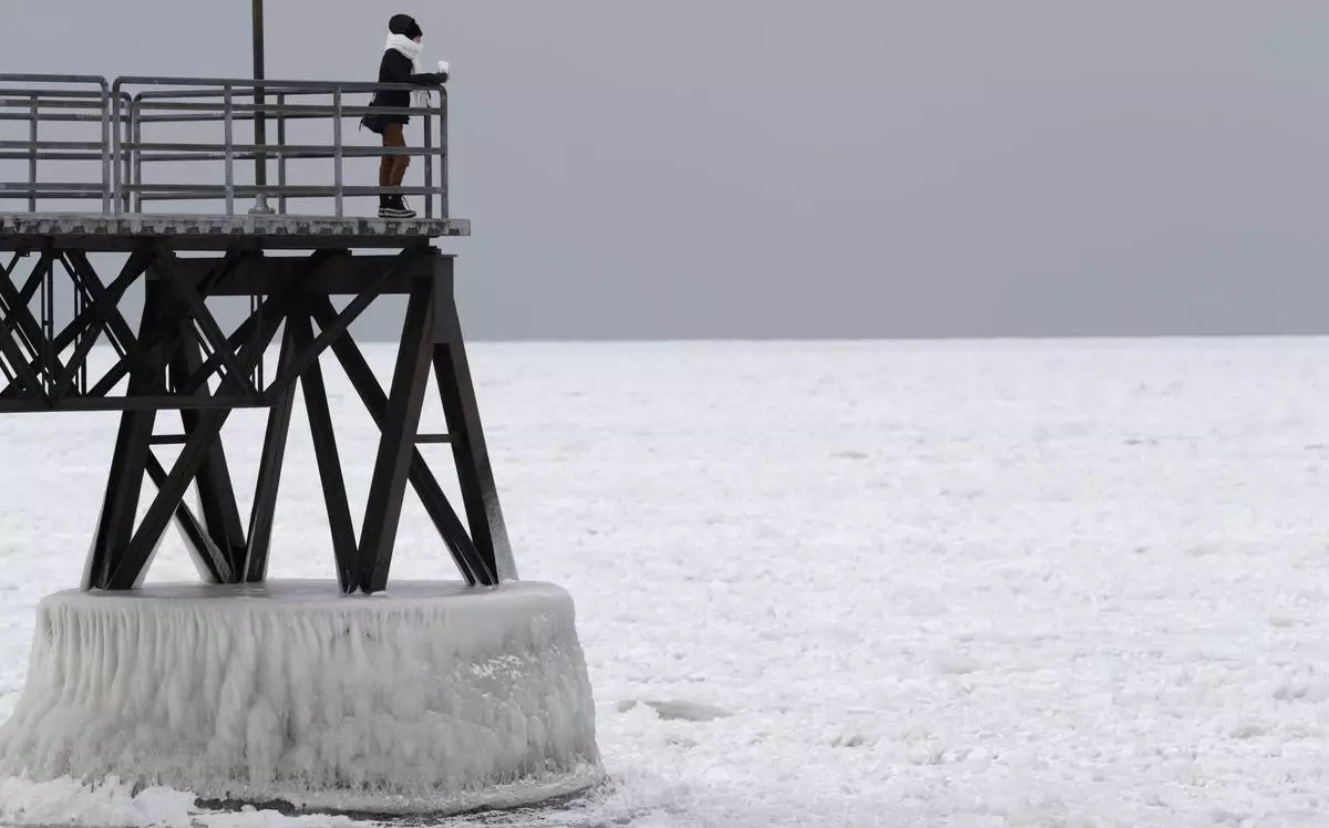 FILE - Michele King, 26, looks out over frozen Lake Erie, Wednesday, Jan. 3, 2018, in Cleveland. (AP Photo/Tony Dejak, File)