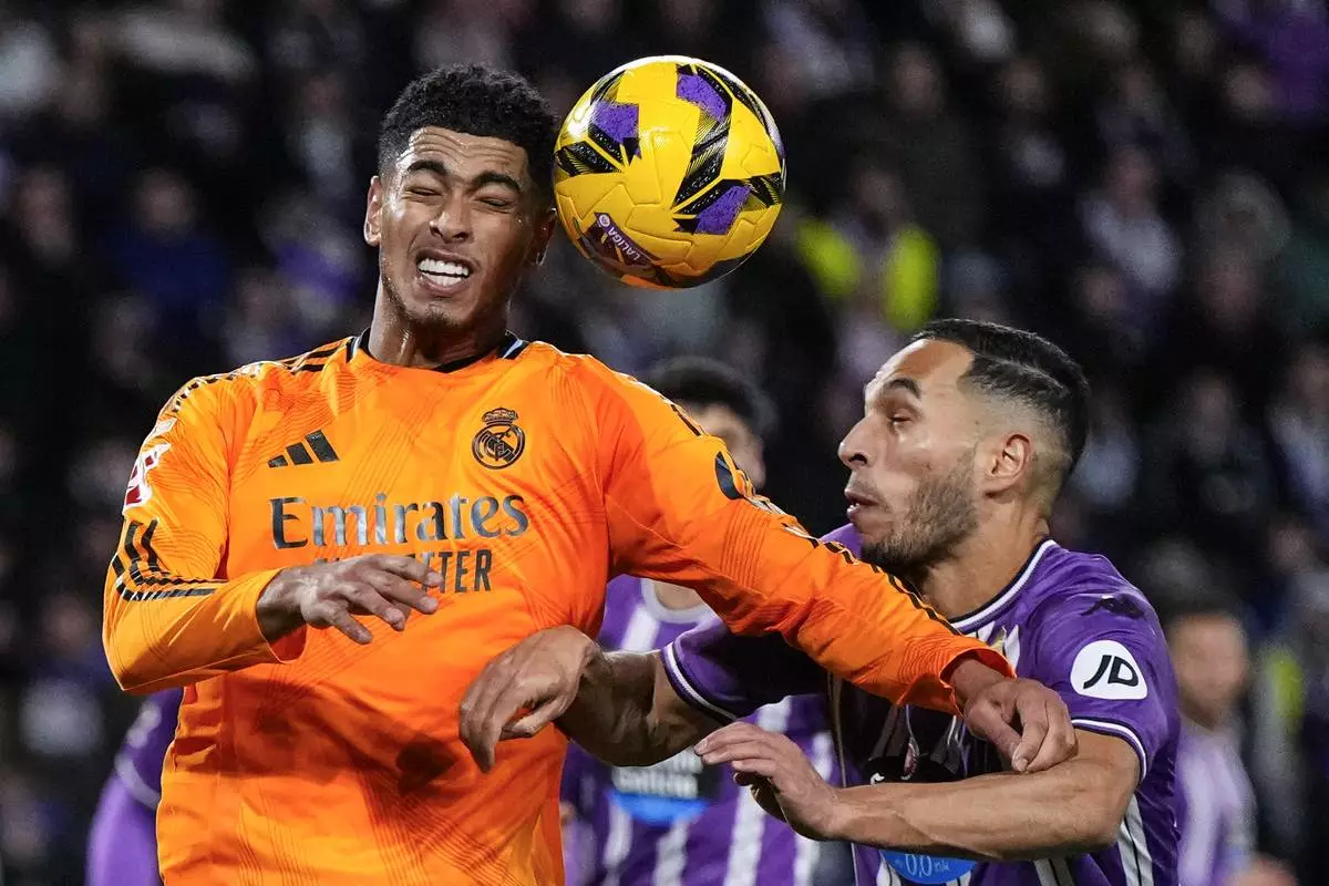 Real Madrid's Jude Bellingham, left, heads for the ball next to Valladolid's Anuar during the Spanish La Liga soccer match between Valladolid and Real Madrid at the Jose Zorrilla stadium in Valladolid, Spain, Saturday, Jan. 25, 2025. (AP Photo/Manu Fernandez)